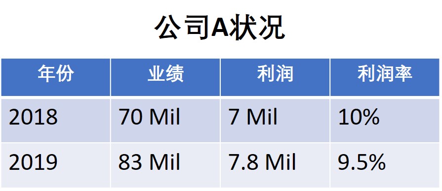 公司A在2018年的销售是70 Mil;在2019年的销售是83 Mil。2018年的净利润是7 Mil;在2019年的净利润是7.8 Mil。它的利润率(Profit Percentage)是10% 与 9.5%。
